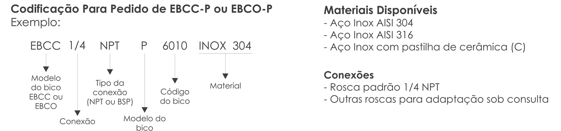 O bico EBCC-P é fabricados em padrão de jato cone cheio Possuem alto poder de impacto, garantindo uma distribuição uniforme da pulverização com gotas médias a grandes, mantendo eficiência no processo de limpeza ou aplicação química.