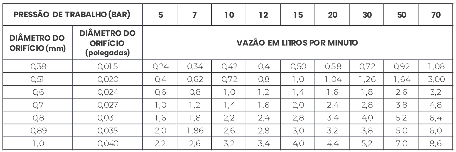 Faixa de vazão: de 0,24 L/min até 8,6 L/min (dependendo da pressão e orifício)
